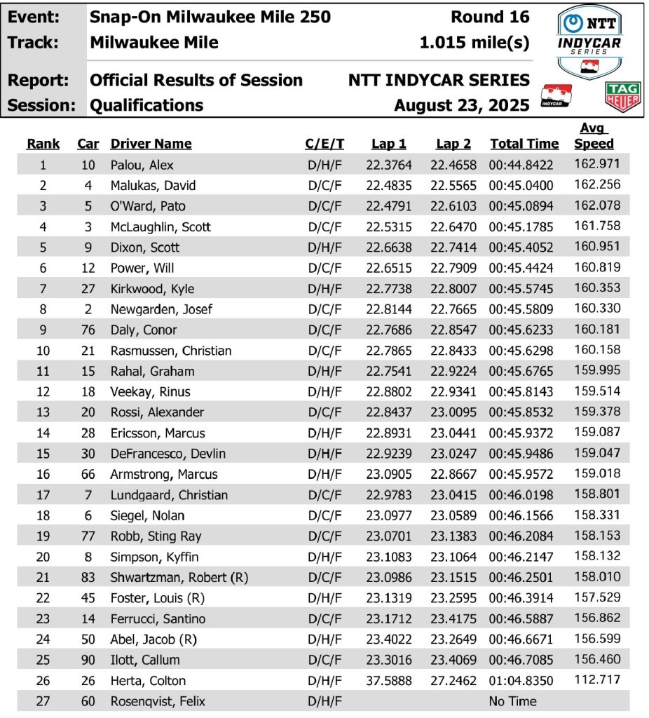 El tetracampeón 2021/2023/2024/2205, de 28 años, promedió 162,971 millas opr hora para sus dos vueltas clasificatorias (las 27 máquinas giraron cada una a su tiempo en solitario, como lo indica el reglamento en los “short ovals”) y postergó a David Malukas (Dallara-Chevrolet de AJ Foyt Enterprises), quien registró 162,256 mph. El 3er puesto correspondió a Patricio O’Ward (Dallara-Chevrolet de Arrow McLaren), quien marcó 162,078 mph.