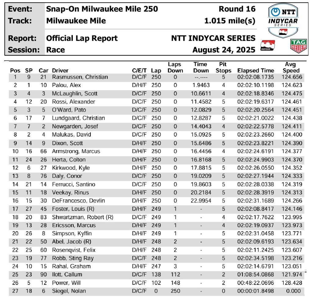 En cuanto a las principales posiciones del certamen, Palou manda con 670 unidades (el «Tetra» 2021/2023/2024/2025 no podrá igualar el récord de diez éxitos en una temporada), 165 más que O’Ward (confirmado subcampeón) y 237 más que Dixon. Con su estreno victorioso, Rasmussen trepó de 13° a 12° en la tabla anual.