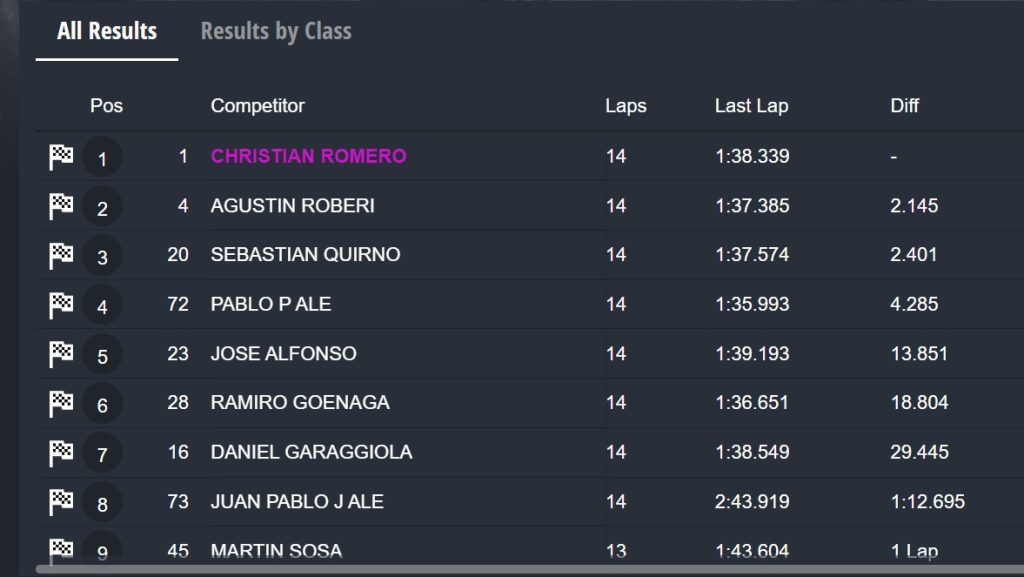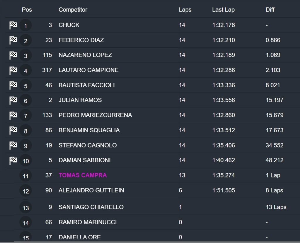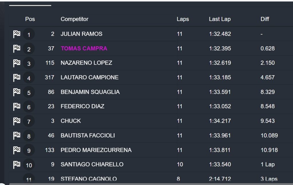 La carrera tuvo muchos sobrepasos e incertidumbre hasta el final, como el caso del último escalón del podio, que lo cerró Santiago Chiarello, defendiéndose de Lautaro Campione que culminó cuarto. A continuación quedó Julián Ramos, el campeón, que más temprano se había llevado la «pole» por apenas una milésima sobre Campra.