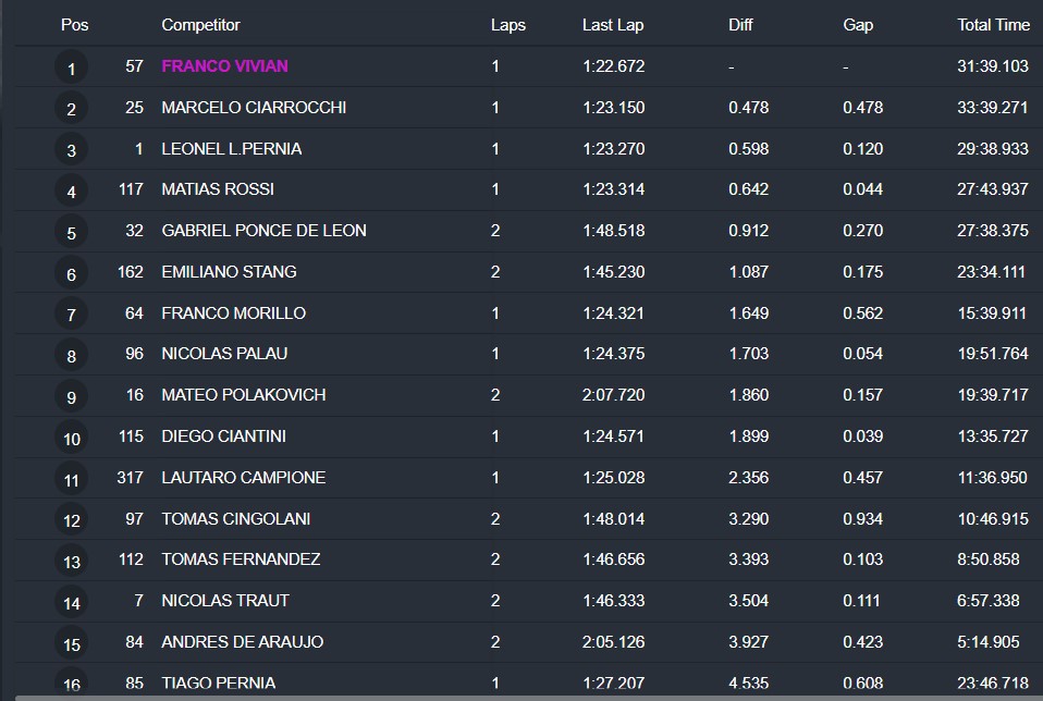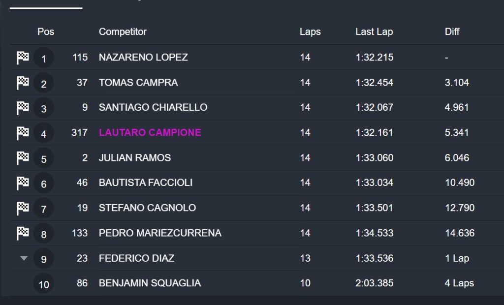 Lautaro Campione sigue a paso firme y quedó cuarto, a un poco más de dos segundos de la punta pero cuidando su posiciones sin problemas por detrás. En quinto lugar finalizó Bautista Faccioli, que dominó con holgura a el líder del torneo Julian Ramos, que no se mostró en su mejor versión.