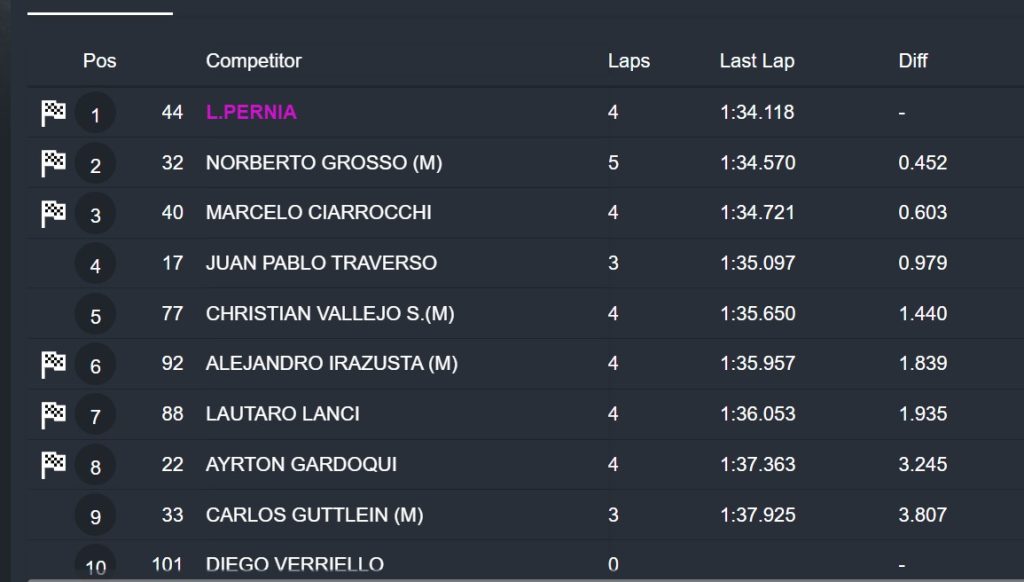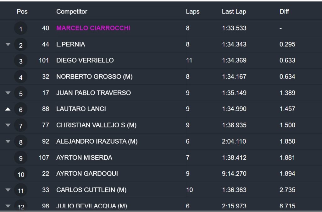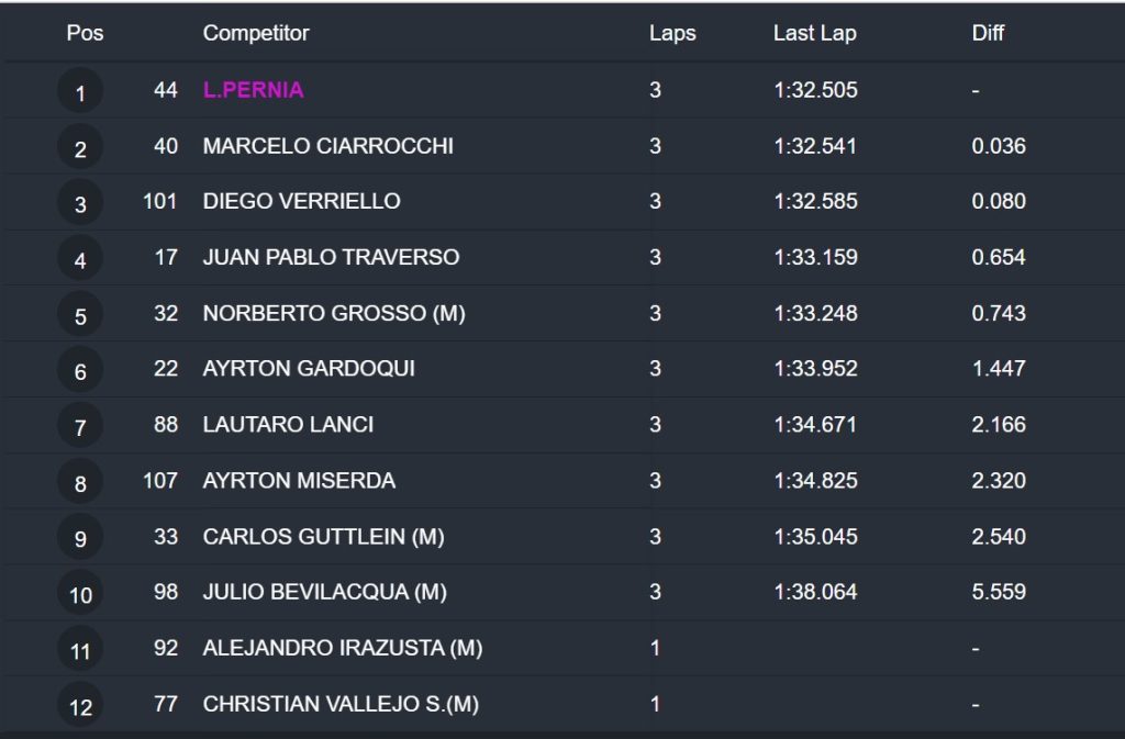 Tercero fue el último ganador Diego Verriello, que con el Cronos del Octanos Competición se ubicó a 0.633. Completaron los primeros lugares del clasificador: 4º Norberto Grosso, 5º Juan Pablo Traverso, 6º Lautaro Lanci, 7º Christian Vallejo, 8º Alejandro Irazusta, 9º Ayrton Miserda y 10º Ayrton Gardoqui.