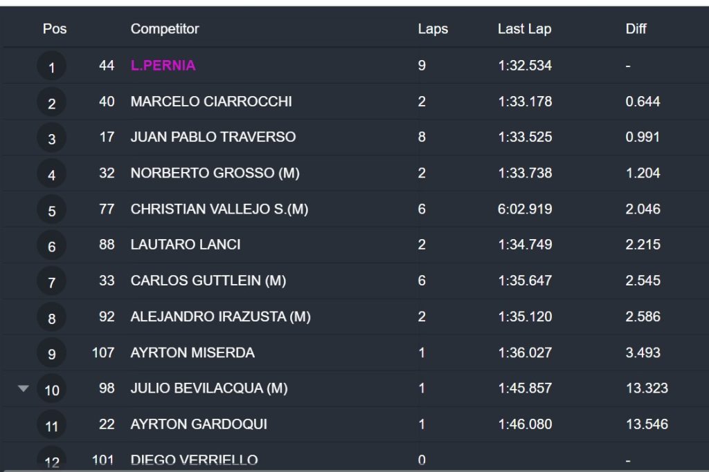 Con los 12 puntos que le dio la “pole position”, Pernía incrementó su ventaja en la Copa Top Race de 1 a 7 puntos sobre Verriello, ganador de la 1ª fecha en el «Oscar y Juan Gálvez». El otro piloto que tiene posibilidades matemáticas de adjudicarse el mini certamen es Norberto Grosso (Ford Mustang), que está a 14 puntos del campeón 2025 del TCR South America luego de clasificar 5º a 0s743.