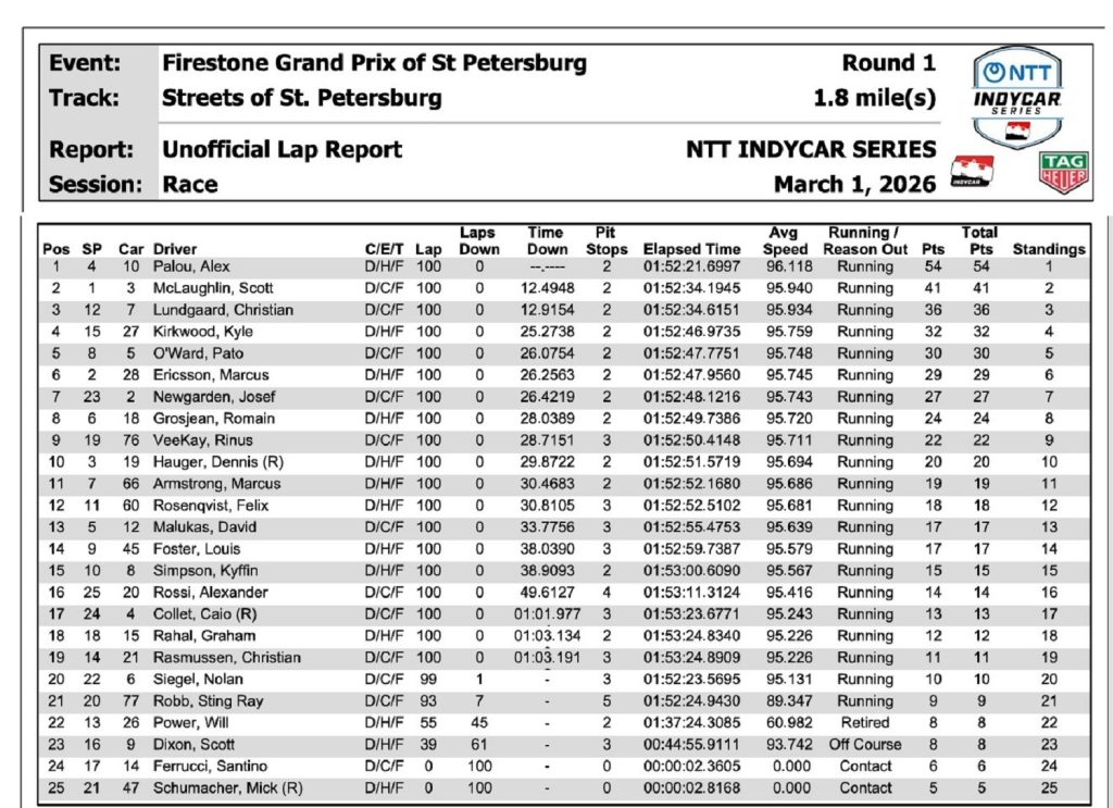 El certamen, que tiene a Palou como líder con 54 puntos, seguido por McLaughlin (41) y Lundgaard (36), proseguirá el fin de semana entrante, en ocasión de la 2ª fecha en el circuito oval de una milla de Phoenix.
