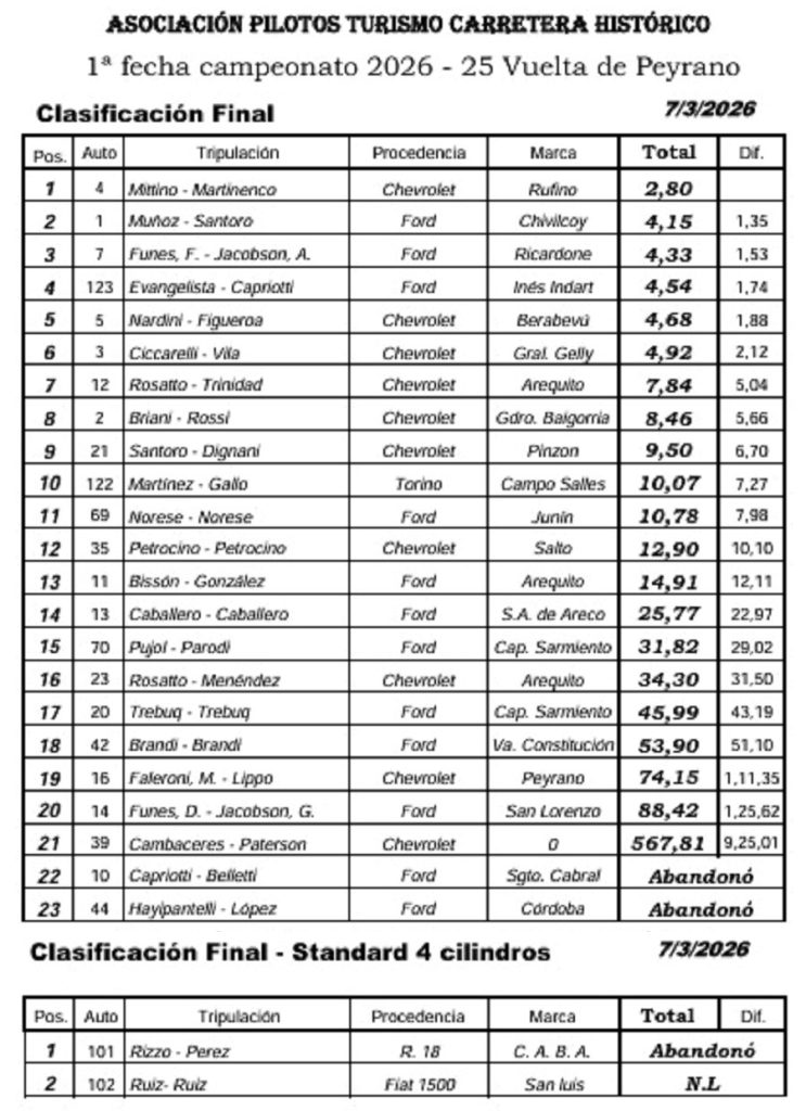 También debemos destacar la labor de otro nicoleño Nazareno Dignani, quien habitualmente fue navegante de Juan Carlos Faleroni (tambien representantes de «Clasificando»), ante su ausencia lo hizo con Santoro de Pinzón. realizado dos muy buenas actuaciones, una de ellas en el podio con un notable segundo lugar.