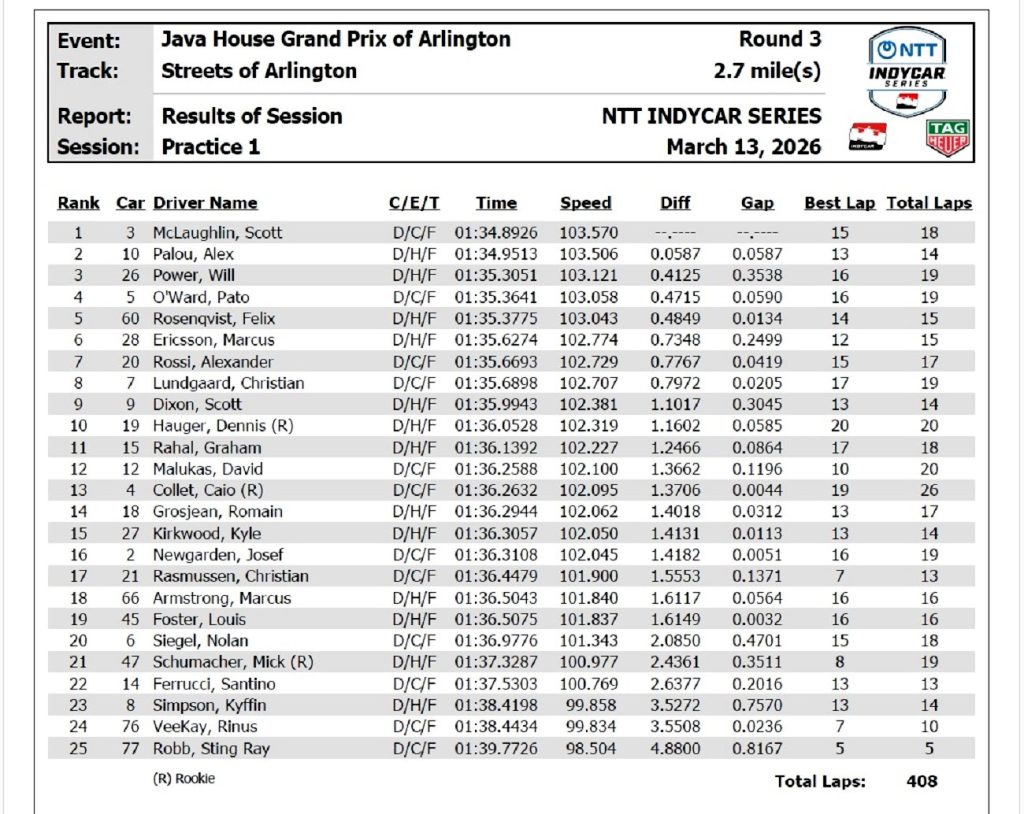 Scott Mclaughlin, a bordo del Dallara alistado por el Team Penske, dominó la Práctica 1 que la IndyCar llevó adelante en el circuito urbano que recorre las calles de la ciudad de Arlington, Texas.