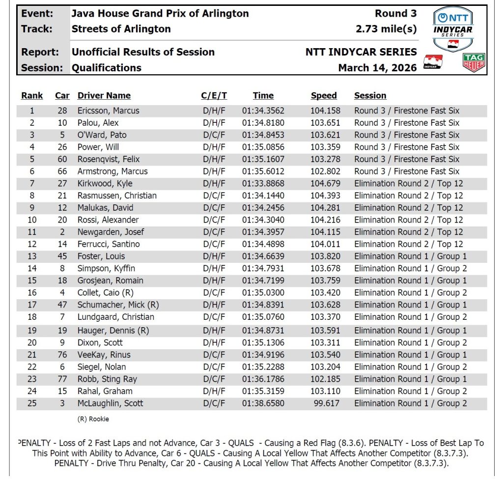 Marcus Ericsson fue el gran protagonista de la clasificación del Gran Premio de Arlington y se quedó con la pole position para la tercera fecha de la temporada 2026 de la IndyCar. El piloto sueco marcó el mejor tiempo en la instancia final y superó a Álex Palou, que finalizó segundo y completará la primera fila para la carrera del domingo.