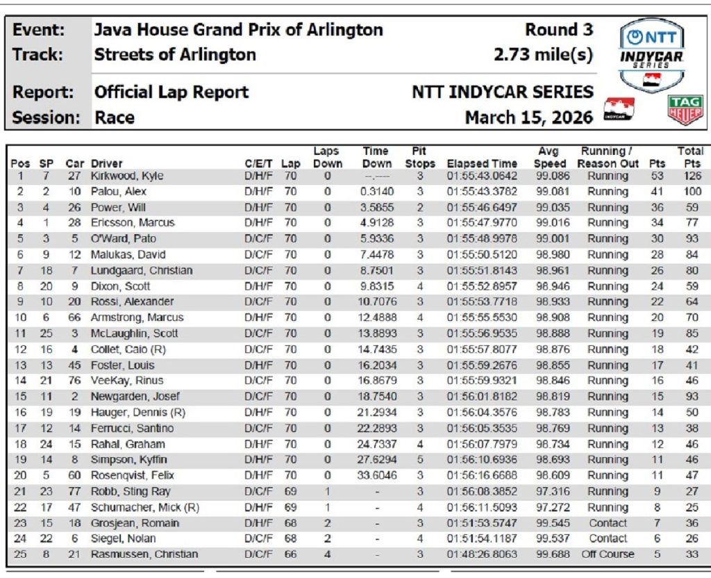 De esta forma, Kirkwood obtuvo su 6ª victoria dentro de la IndyCar y cerró un fin de semana redondo para la escuadra de la familia Andretti que también supo dominar la Clasificación con Marcus Ericsson en la jornada sabatina.