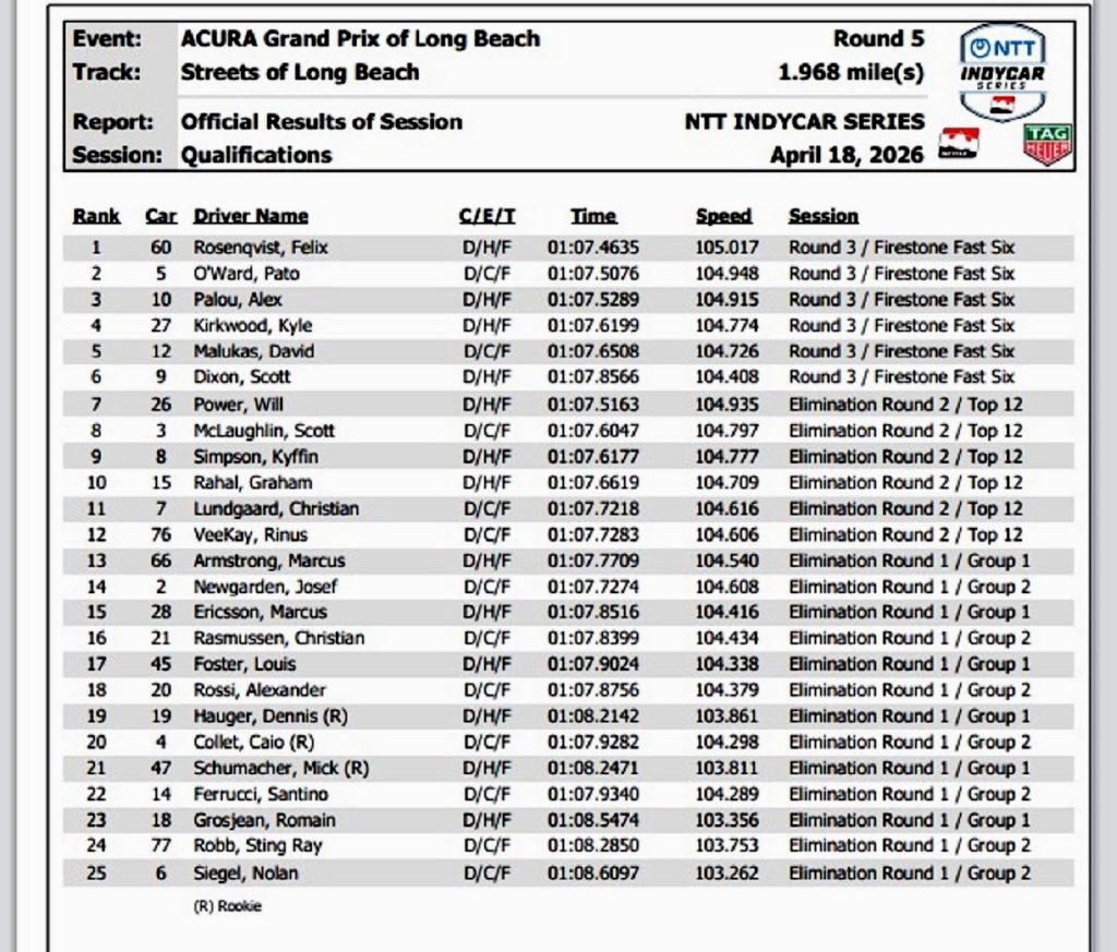 Por primera vez en la temporada de IndyCar 2026, Felix Rosenqvist logró ser el más rápido de la ronda definitoria de una clasificación, al conseguir por 7ª ocasión la «pole» en sus 118 presentaciones y volver a hacerlo en el circuito callejero de Long Beach (California) como en 2024, y con el Dallara Honda de Meyer Shank Racing marcó 1m07s4635 (a 169,009 Km/h.) para recorrer el circuito de 3.167 metros y que es sede de una carrera desde 1975.
