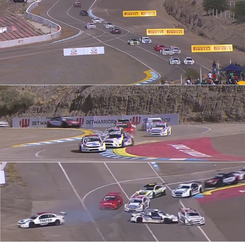 Primera imagen, Traverso largó tercero y al llegar a la chicana toma la punta por la parte interna, en la segunda, su rival no quiere aflojar y se pasa en la chicana y el auto se descontrola y vuelve, alli le pega atrás al nicoleño que sale para la parte externa y como se observa en la ultima imagen, por suerte pudo volver retrasado y avanzó hasta el cuarto lugar con el mismo ritmo de la punta.